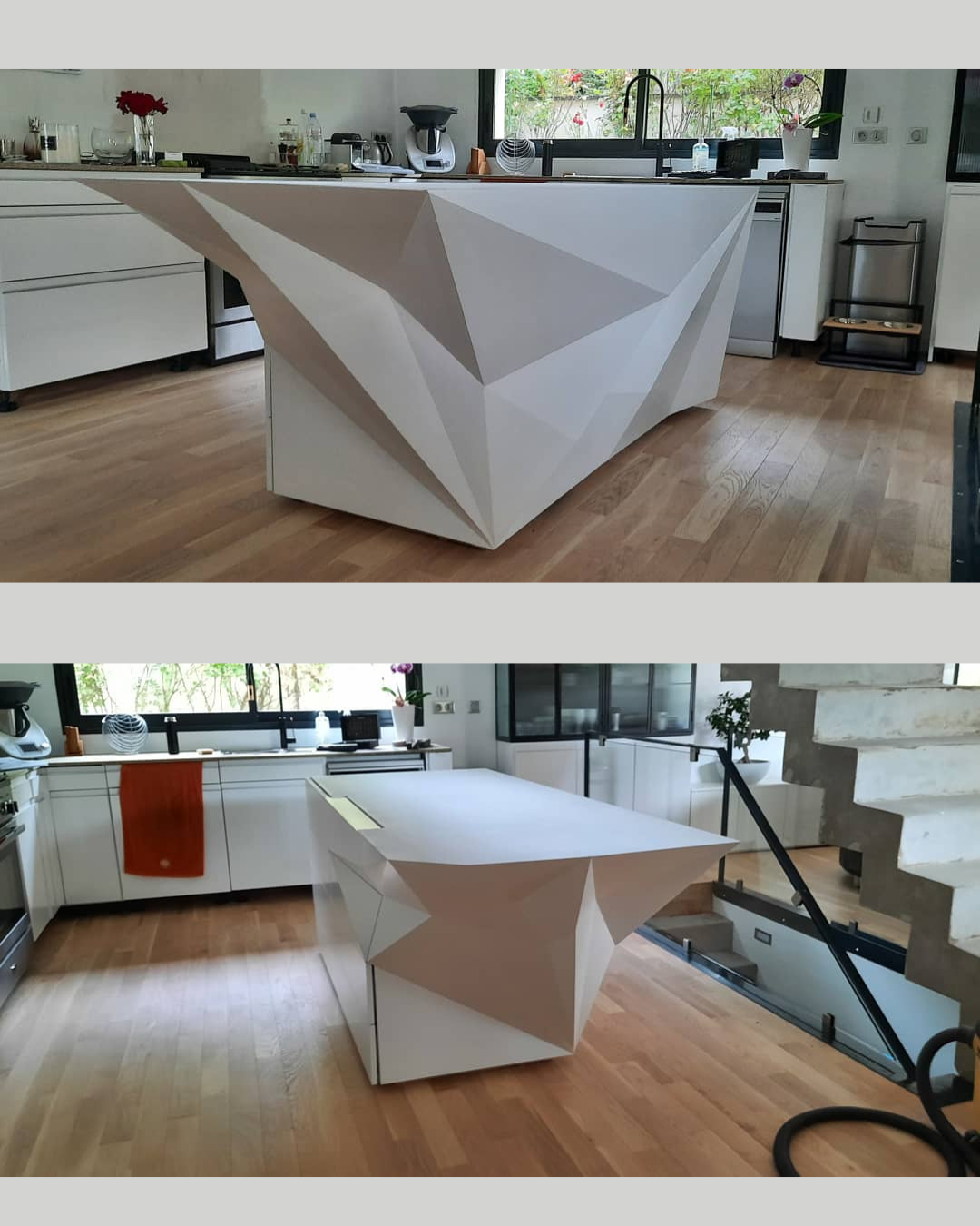 Fabrication et installation d’un îlot de cuisine en médium peint blanc. Cet îlot sur mesure est composé de 6 tiroirs équipés du système “push-to-open” de chez Blum, offrant une ouverture fluide et sans poignée pour un design épuré et contemporain.